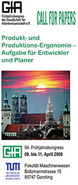 Der 54. Frühjahrskongress der Gesellschaft für Arbeitwissenschaft 2008 hat sich daher mit aktuellen Problemen und Forschungsergebnissen zu den Themenfeldern Produkt-Ergonomie, Produktions-Ergonomie, Arbeitsorganisation und Arbeit und Gesellschaft auseinandergesetzt.